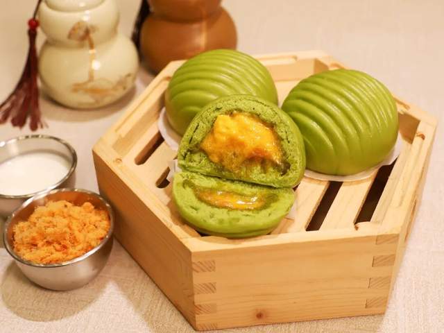 清新綠茶外皮,包裹流沙餡與香脆肉松,茶香清新,咸甜適口,風(fēng)味獨特。